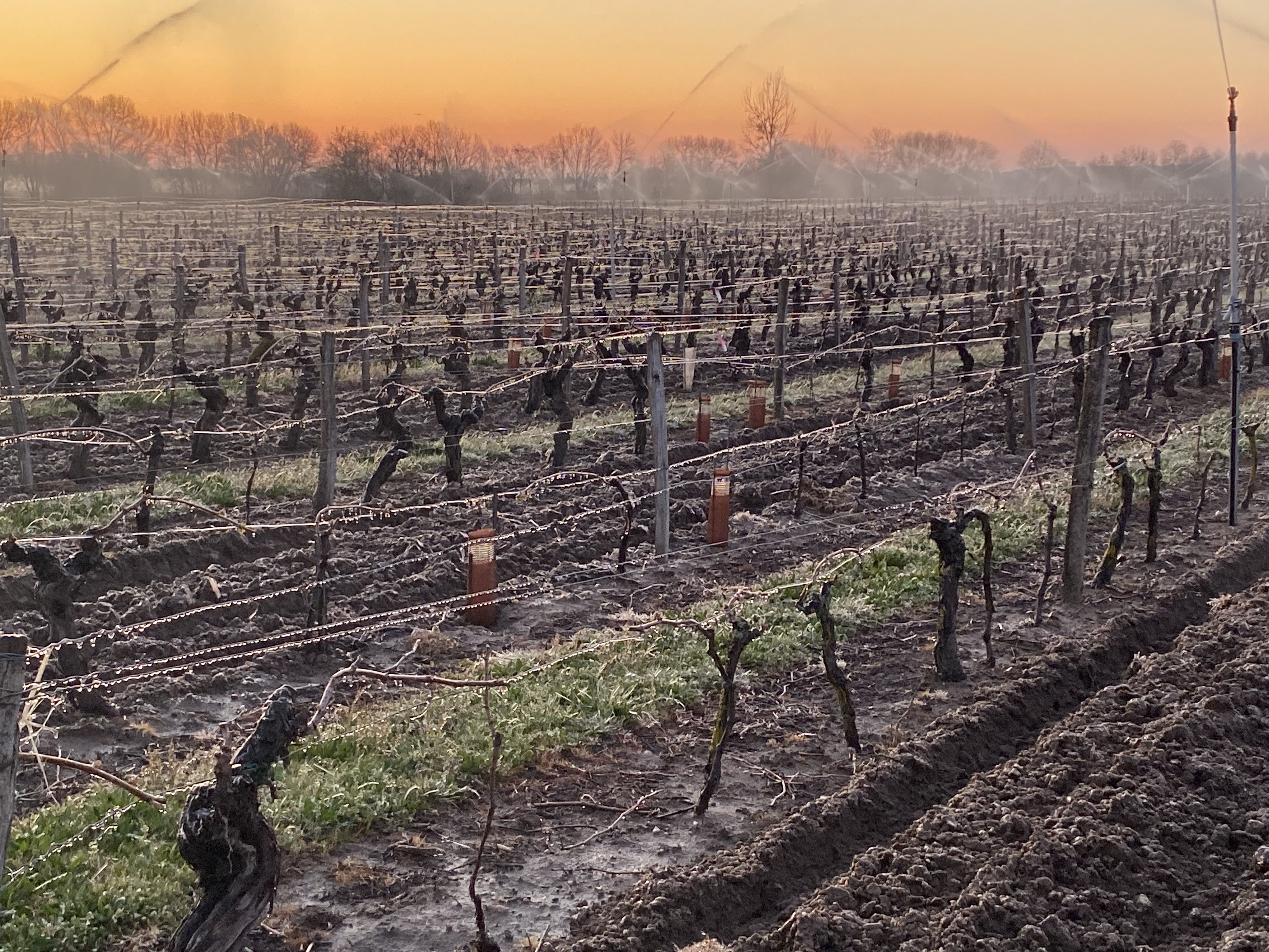 A ce jour, l’aspersion est la solution qui permet de garantir la meilleure protection contre le gel, avec une protection effective jusque -7°c. Néanmoins, cette solution requiert la présence suffisante d’eau, un débit de 40m3/heure par hectare étant nécessaire. L’aspersion s’effectue par un arrosage quadrillé de 18m x 18m. Plus de 300m3 d’eau par hectare peuvent donc être utilisés lors d’une nuit de gelée.